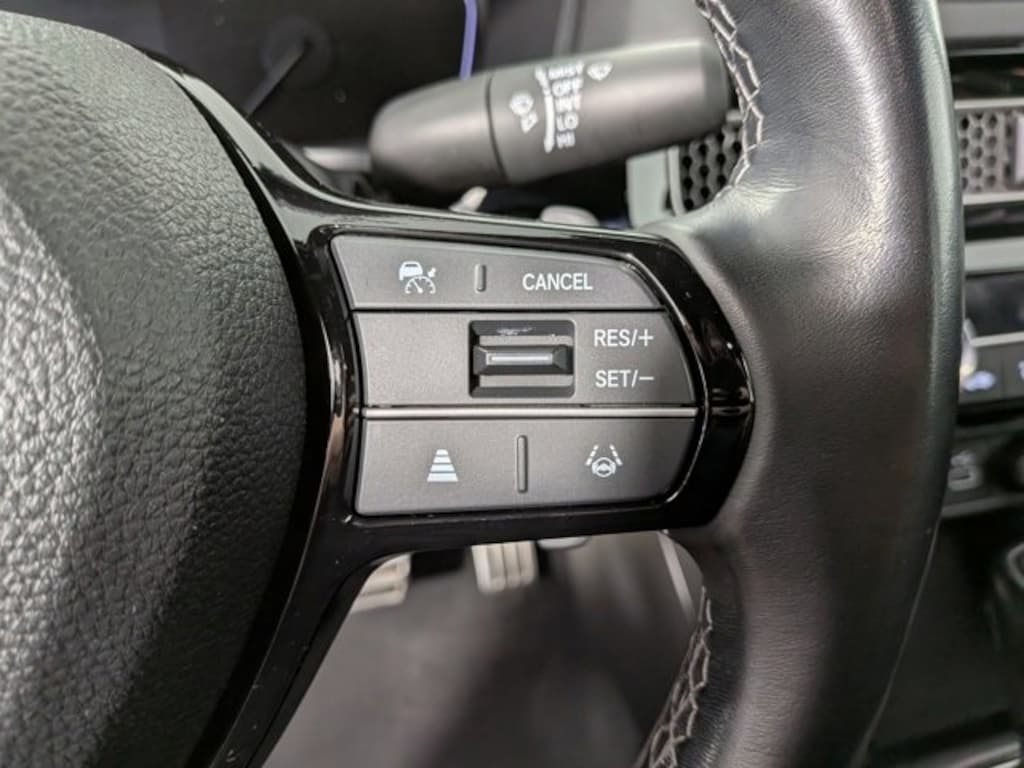Check out all the standard equipment Black Cloth, 4-Wheel Disc Brakes, 8 Speakers, ABS brakes, Adaptive Cruise Control: Adaptive Cruise Control (ACC) with Low-Speed Follow, Air Conditioning, Alloy wheels, AM/FM radio, Apple CarPlay/Android Auto, Auto High-beam Headlights, Automatic temperature control, Brake assist, Bumpers: body-color, Cloth Seat Trim, Delay-off headlights, Driver door bin, Driver vanity mirror, Dual front impact airbags, Dual front side impact airbags, Electronic Stability Control, Emergency communication system: HondaLink, Exterior Parking Camera Rear, Forward collision: Collision Mitigation Braking System (CMBS) + FCW mitigation, Four wheel independent suspension, Front anti-roll bar, Front Bucket Seats, Front Center Armrest, Front reading lights, Fully automatic headlights, Illuminated entry, Knee airbag, Leather Shift Knob, Leather steering wheel, Low tire pressure warning, Occupant sensing airbag, Outside temperature display, Overhead airbag, Panic alarm, Passenger door bin, Passenger vanity mirror, Power door mirrors, Power steering, Power windows, Radio data system, Radio: 180-Watt AM/FM Audio System, Rear anti-roll bar, Rear side impact airbag, Rear window defroster, Remote keyless entry, Security system, Speed control, Speed-sensing steering, Steering wheel mounted audio controls, Tachometer, Telescoping steering wheel, Tilt steering wheel, Traction control, Trip computer, and Wheels: 18 Gloss Black Alloy.
